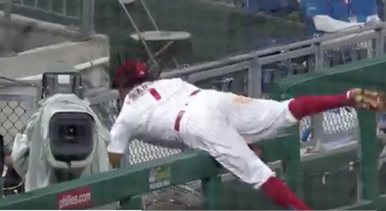 Watch: Maikel Franco flips over railing into camera well, leaves game