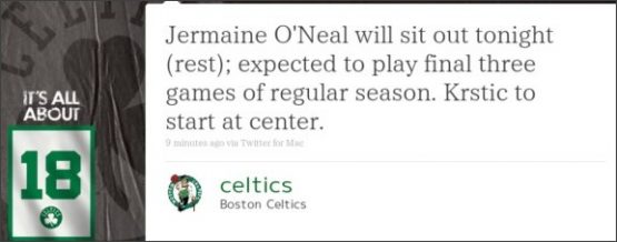 Twitter / Boston Celtics: Jermaine O'Neal will sit o … via kwout Jermaine O'Neal is sitting out tonight's game against…