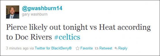 Twitter / @gwashburn14: Pierce likely out tonight … via kwout It looks like we're going to have more of Sasha…