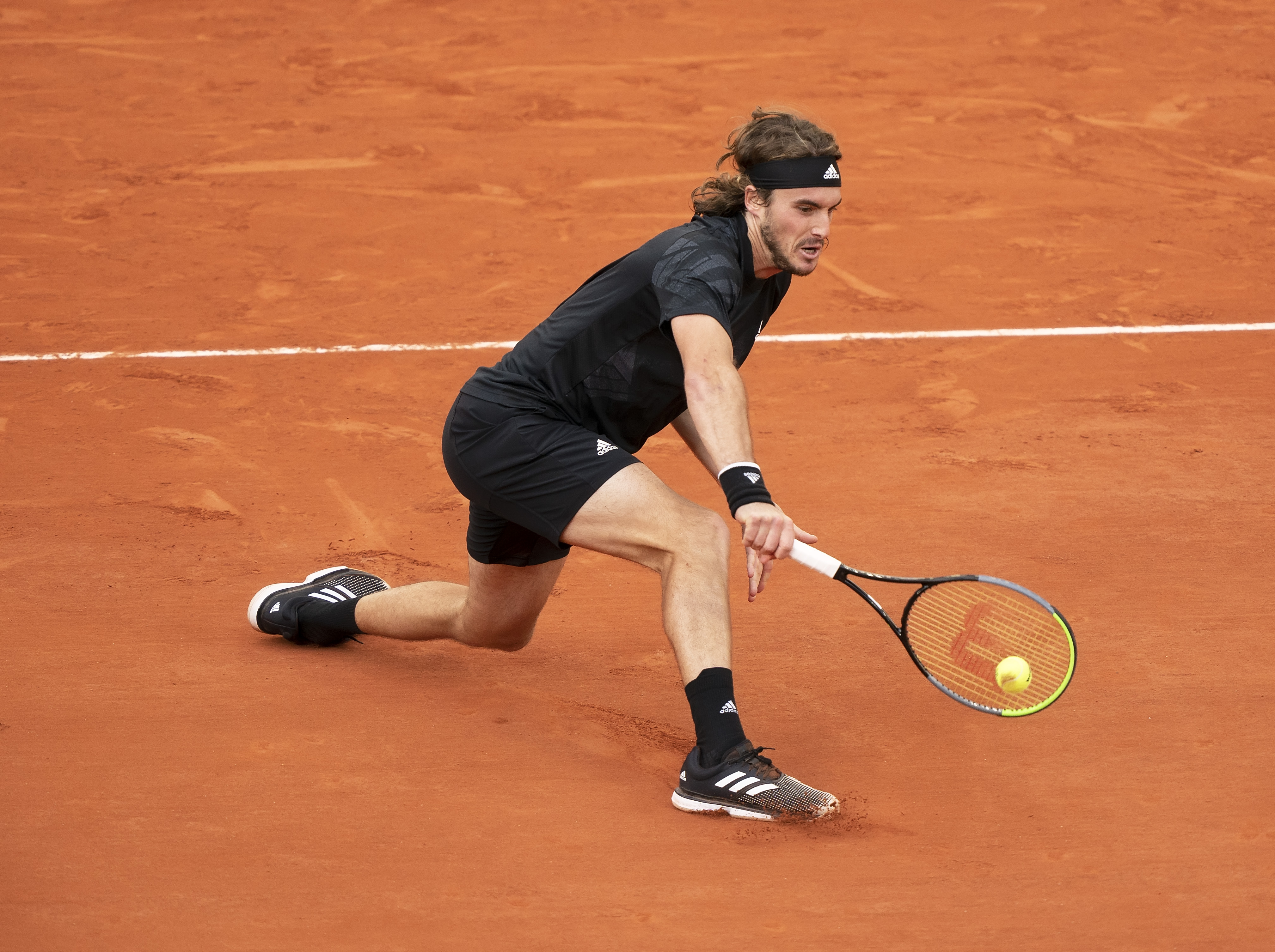 Oct 7, 2020; Paris, France; Stefanos Tsitsipas (GRE) in action during his match against Andrey Rublev (RUS) on day 11 at Stade Roland Garros. Mandatory Credit: Susan Mullane-USA TODAY Sports