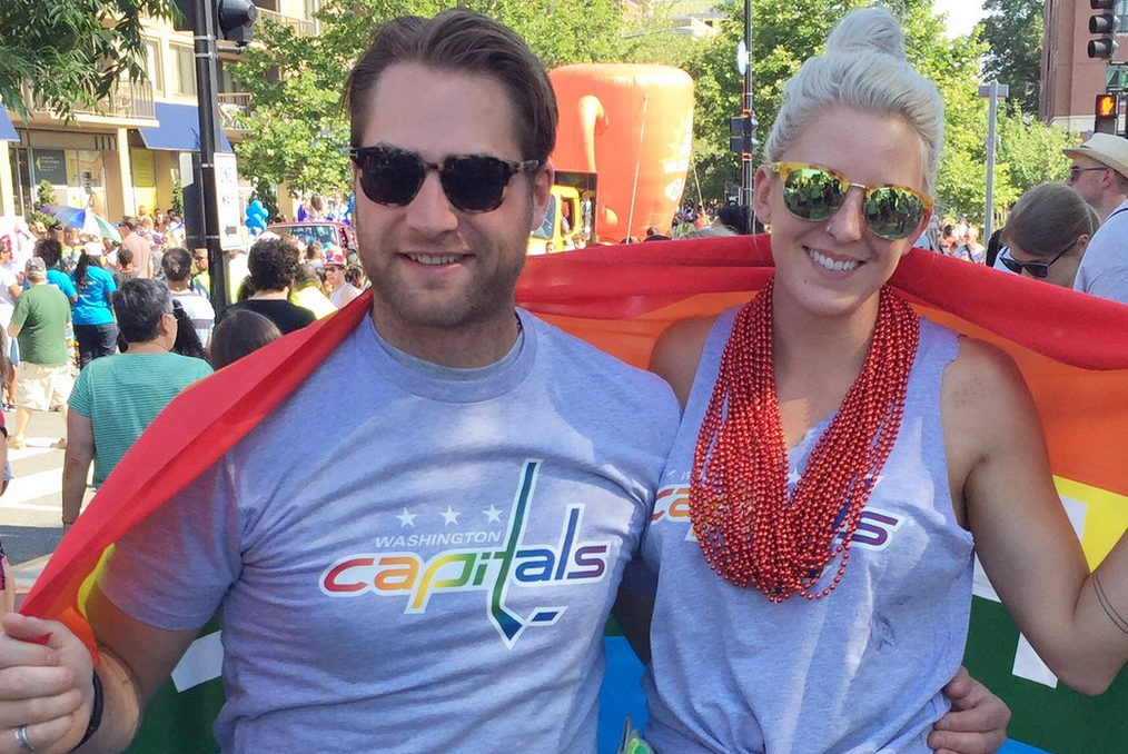 Holtby and his wife, Brandy, marched in the Capital Pride Parade on Saturday, supporting LGBTQ rights, and here’s a photo showing them there.