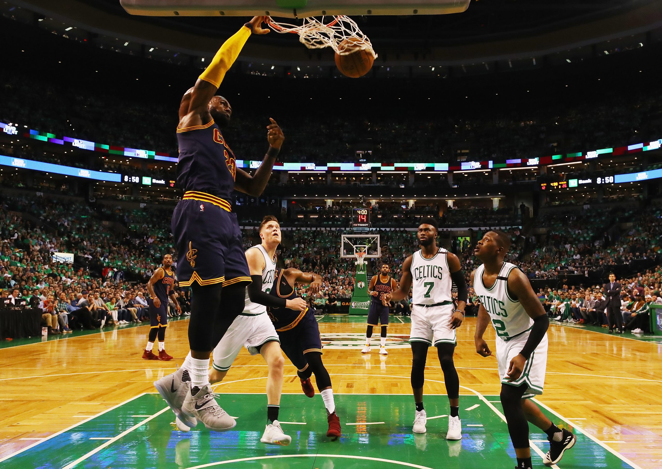 The Cavaliers arrived at the TD Garden and immediately got to work. They wasted no time jumping out to a huge lead, leading by as many as 21 points in the first quarter. Kevin Love got going early, scoring the Cavs’ first 8 points. In all, the Cavaliers’ Big Three was dominant and efficient. Love finished the game with 15 points and 11 rebounds and a +/- of +43 in just 28 minutes of game play. LeBron James finished with 35 points on a super-efficient 13-for-18 shooting, while Kyrie Irving finished with 24 points on 9-for-15 shooting.